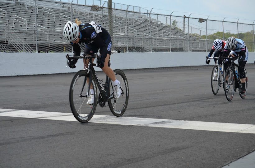 The final lap, Emily pushed the tempo even further, got about 5 wheel lengths ahead, and made everyone chase. I was a few wheels back with ½ a lap til the finish when I saw Laura jump on the outside. I had a gap on the inside of everyone so I stood up and jumped with her. I yelled to Emily that I was coming up on her left and Laura and I were shoulder to shoulder after we passed her. I had the inside line in the final turn and was able to pull ahead by a couple of wheel lengths before the line.